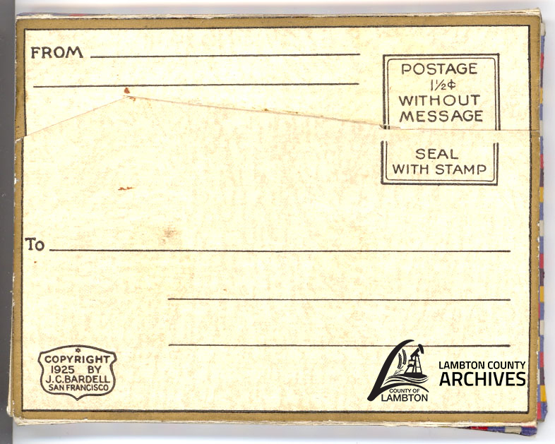 In 2008, Floyd Brown donated travel documents to the Lambton County Library Archives which belonged to his father. George Brown was also bitten by the travel bug, and in 1929 George and his family embarked on a two-month vacation along the Canadian and American west coast. George Brown saved a remarkable amount of material from his trip, including postcards, photographs, CPR schedules and menus, hotel brochures and travel guides which formed a fascinating snapshot of North American travel and tourism. Material comes from locations as varied as Banff, Victoria, Yosemite National Park, San Diego and Tijuana.