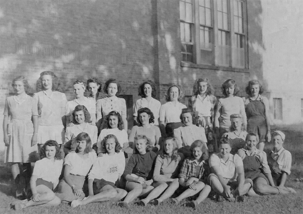 Farmerettes outside of the Forest High School in August 1944. Helen (Abernathy) Finn is standing, on the extreme left of the photo.