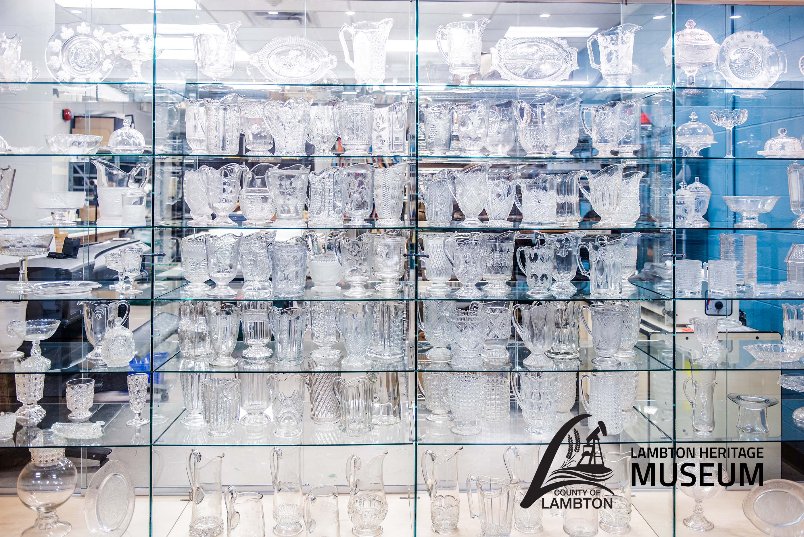 There are more than 600 pieces of pressed glass at the museum. The collection started with a donation by Fred Walden. It included the largest collection of pressed glass water pitchers in Canada. A further 200 pieces were donated by W.H. Hostetler. The richness of the museum's collection makes it an important resource for pressed glass enthusiasts.
